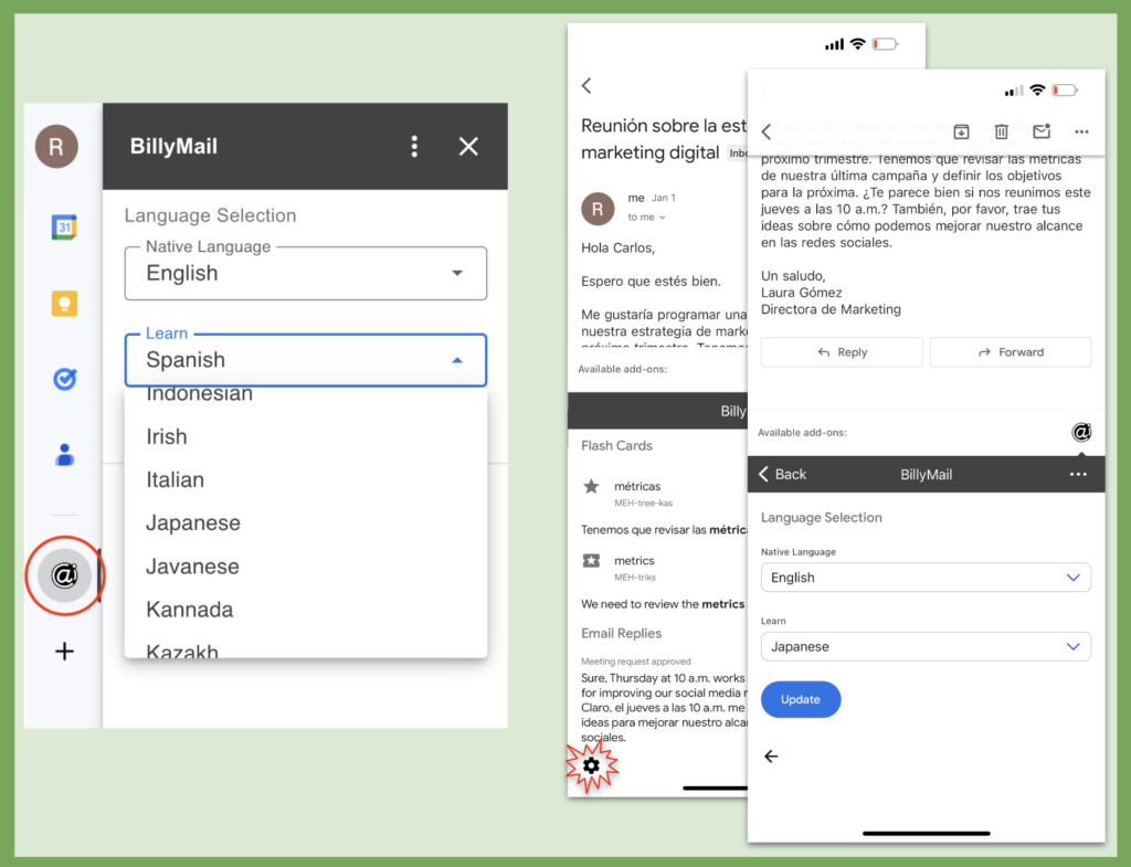 BiliMail is a Gmail™ Add-on which is accessible directly from your Gmail™.  To get started, simply install the add-on, set your languages, and BiliMail will help you each time an email is opened.